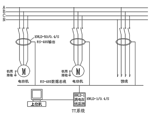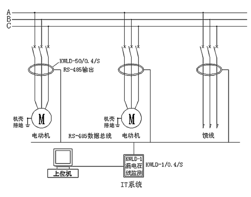 KWLD-6000系列智能漏電監測系統主要由 KWLD-1漏電監測主機、KWLD-50/80 智能漏電檢測互感器組成。漏電互感器通過串行總線,將漏電流數據上送到監測主機,監測主機通過TCP/IP協議與后臺監控計算機進行數據交換,實現通訊組網。并且陰雨天絕緣整體劣化情況自動適應,采用模糊算法干擾屏蔽,使其工作穩定可靠。